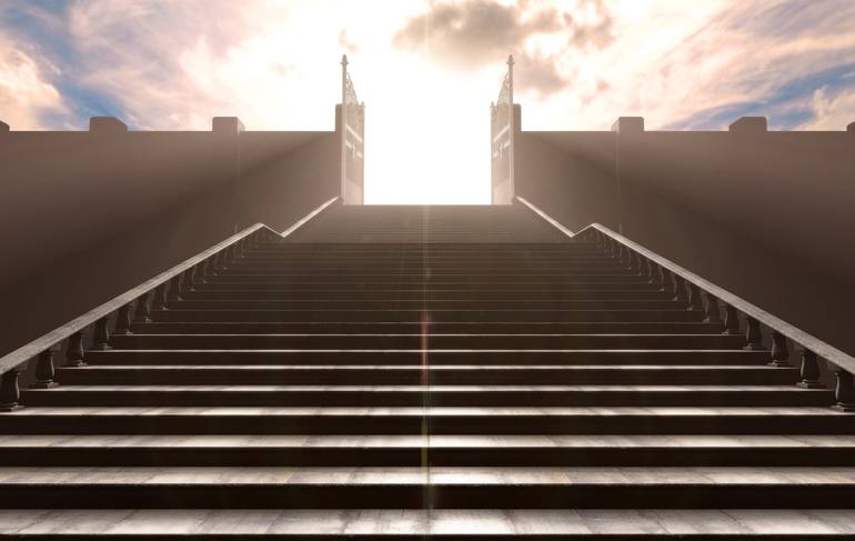 A depiction of the pearly gates of heaven open with the bright side contrasting with the duller foreground and a stairway leading up to it