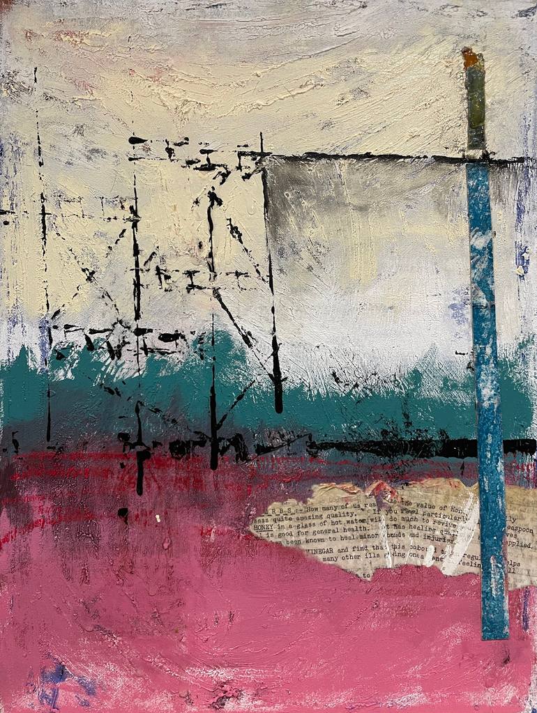This small piece was inspired by photographs I had taken of the Belfast city skyline. The city is constantly changing and construction is everywhere. Hence the scaffolding and crane like collage. The countryside is not far away though. I had an old healthy eating manuscript that was hand typed up ab...