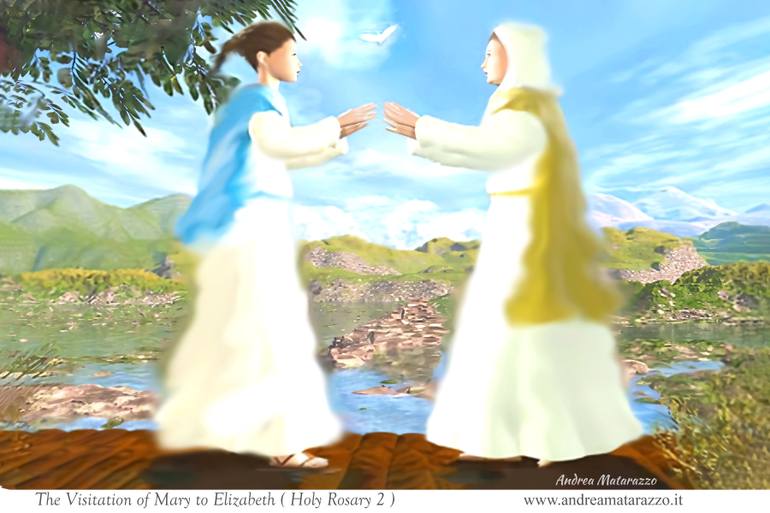 " Visitation " . Mary visits her relative cousin Elizabeth; they are both pregnant: Mary with Jesus, and Elizabeth with John the Baptist. Artwork inspired by famous paintings. The Holy Rosary - Joyful Mysteries 2 - The Visitation. Religious theme interpreted with the modern Computer Graphics 3d 2d.