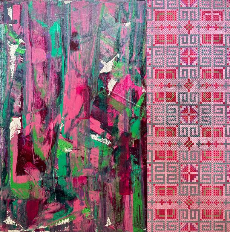 The artist creates a dynamic composition that combines energetic abstract elements and exquisite embroidered patterns. The left side of the canvas is filled with bold, expressive strokes of acrylic paints in rich shades of pink and green. The contrast to this sound is the right side, where the artis...