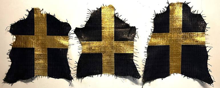 This is a triptych installation of three artworks. Each artwork varies in size, but roughly measures around 60 x 80 cm each. The artworks are intended to be hung by hooks and pinned at the sides. The base of the artworks are created from woven leather and each has a gilded golden cross that has then...