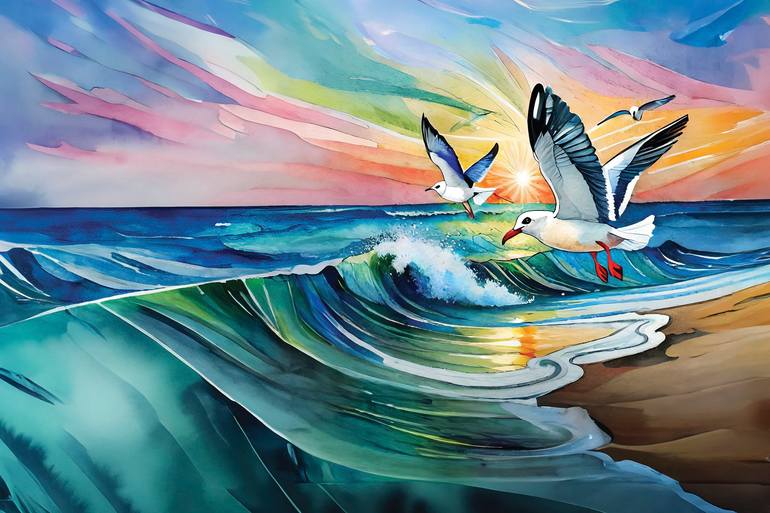 Three seagulls soars gracefully over the vast, open sea, bathed in the warm glow of the westward setting sun. The watercolor illustration captures the natural beauty of the moment, with ocean waves gently rolling below, reflecting the vibrant hues of the sunset—deep oranges, pinks, and purples mergi...