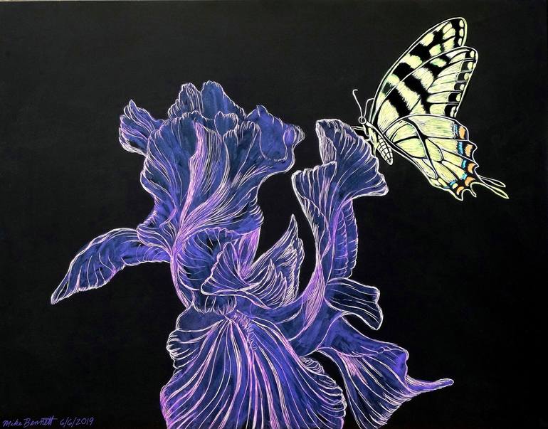 A Tiger Swallowtail rests on a lavender Iris in this scene.