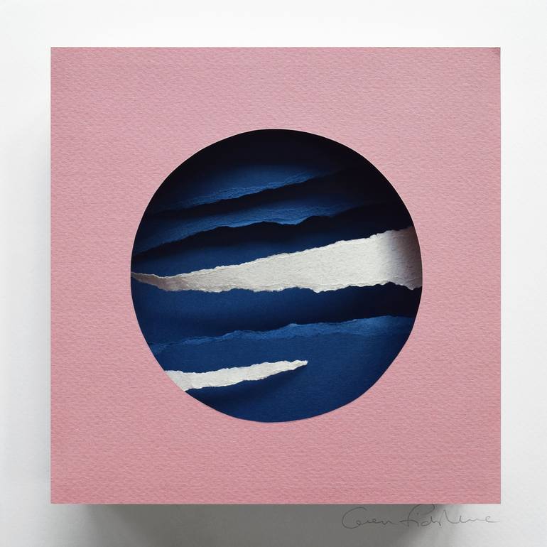 A piece from a collection of six original paper-cut artworks from Owen's 'Torn Giants' series. Each artwork is one of a kind and features an array of torn layers which are framed with a hand-cut circular window mounted on a handmade box assembled in the studio. Each final artwork has been mounted o...