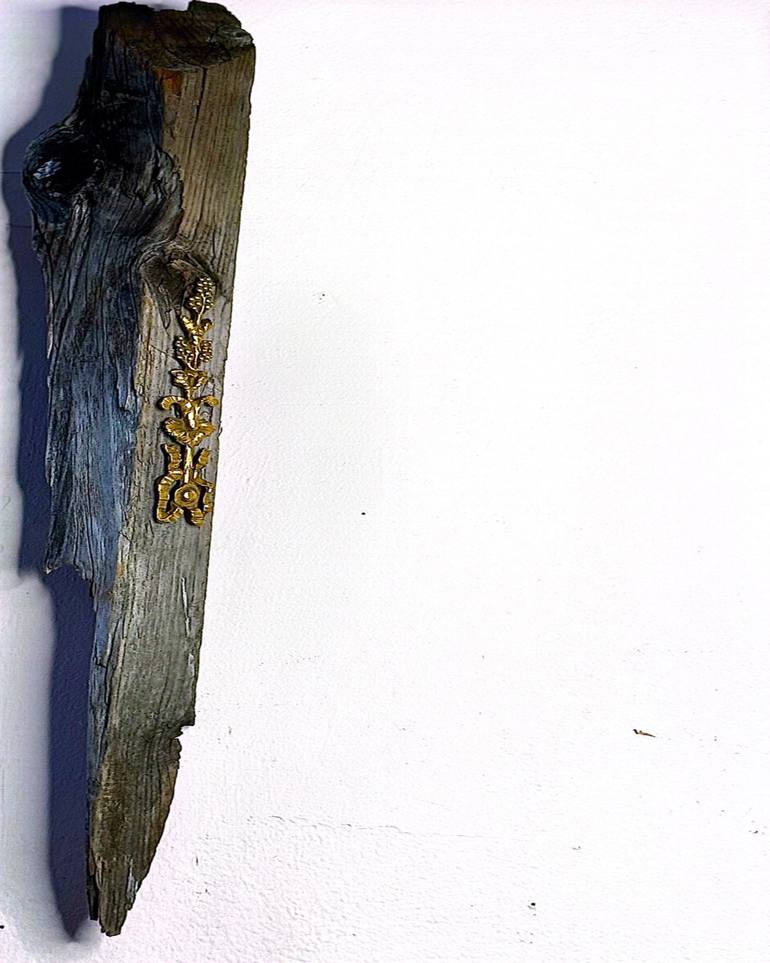 Totem of the Forgotten Bloom is a minimalist sculpture that elevates the quiet dignity of aged wood. The natural contours of the driftwood—marked by time, water, and decay—are subtly interrupted by a vertical motif of golden botanical reliefs, suggestive of growth reclaiming decay. The gold appliqué...