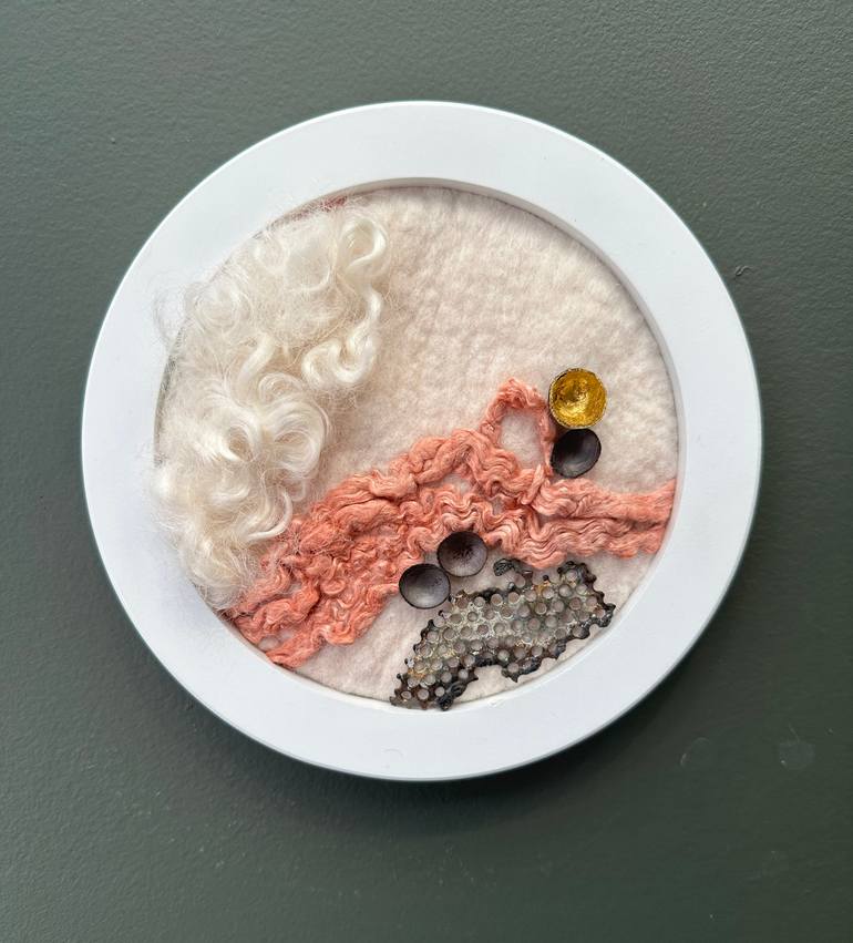 Applying ancestral skills in a contemporary setting, my work comprises studies in fiber entanglement, collage and print. Inspired by the idiosyncrasies of nature and the restorative power of color, I strive to infuse my pieces with a sense of delight, using natural materials: wool, silk, hemp, cotton, flowers, bark and roots. This can take many forms including layering and sculpting with wool to create highly textured felted pieces. Or spinning yarn to create knotted sculptures, incorporating foraged metal and wood. Often using the materials that we’ve lost respect for, or squander. My process tends to start with a loose narrative, and as I work with the materials, I'll respond to the shape of what’s transpiring. I’m always editing and distilling, looking to capture a core idea and critical energy, with a graphic, and hopefully, compelling result. Bodies of work have included: ‘Journeys that I’ll never Take’ which asked questions about our physical and psychological boundaries. ‘Love, Hope & Entanglement’ - an apropos theme given life has become more complex. And ‘Threads That Bind Us’, looking at how we need to move on from concepts of home – whether that be a dwelling, or relationships that hold us in stasis. This work led to the most recent series inspired by our early transition into the Neolithic age - shifting from nomadic behaviors to sedentism, where we created settlements along water courses. Using silk cocoons, a creature's first home as an analogy. I’ve lived in Laguna Beach for 22-years and have journeyed through many career chapters woven together by a creative thread. Prior careers in both theater and experiential design exposed me to different mediums of storytelling. And along with training in color, textiles, design theory and material sustainability, for the last decade I’ve maintained an experimental, material and humanities driven, educational art practice. My work relies on farmers, sheep, shearers, growers, foragers, silkworms; educators and mentors, tool-making craftspeople, and mother nature. I’m eternally grateful to each of them. Commissions welcomed IG .b