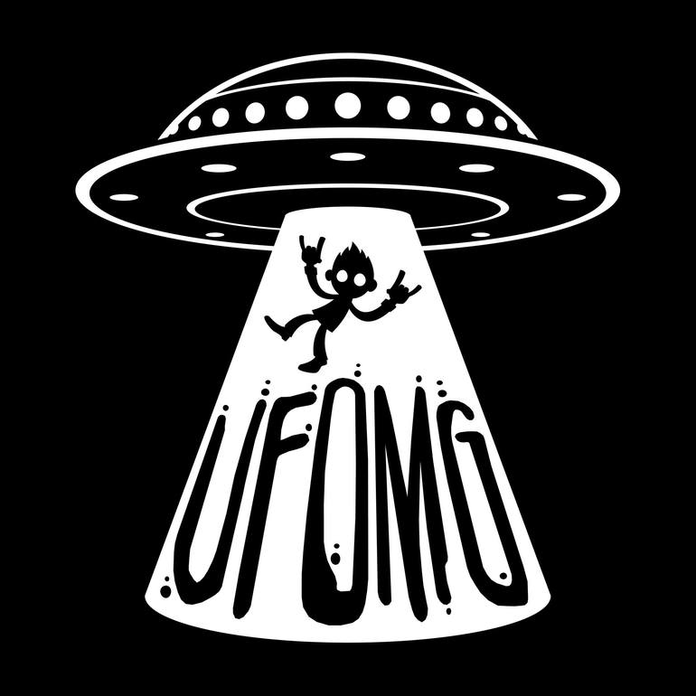 Vector cartoon illustration of a UFO abducting a person that thinks aliens rock with UFOMG text. Tags: UFO, OMG, unidentified, flying, object, oh, my, god, space, spaceship, alien, martian, cartoon, devil, horns, abduction, fourth, kind, humor, saucer