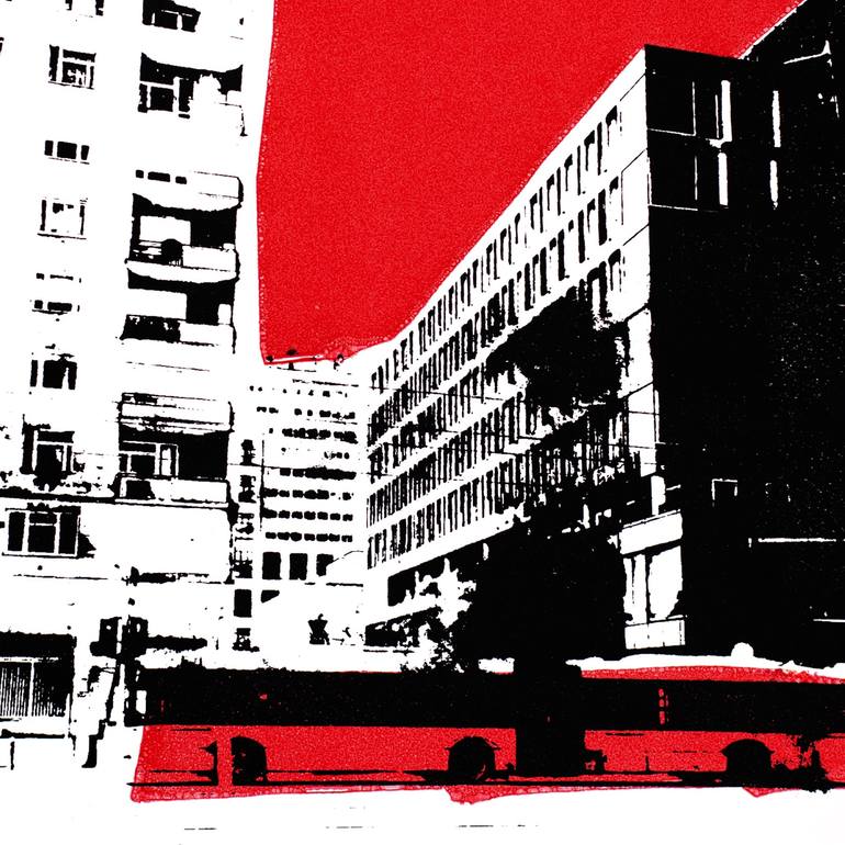 This limited edition graphic artwork captures a dynamic urban scene, with black-and-white architecture highlighted by intense red accents. The bold red background enhances the contrast, adding an energy that disrupts the structured, repetitive geometry of the buildings. Inspired by the contrasts and...