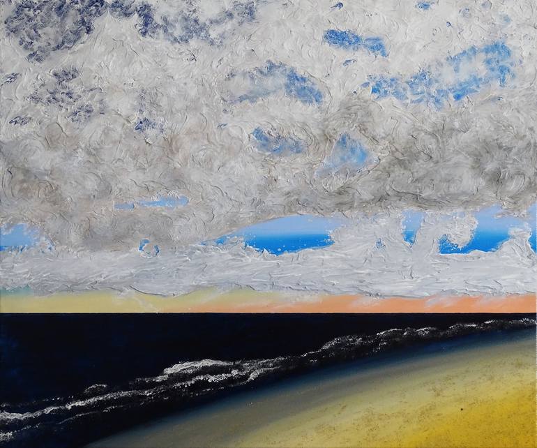 “Usedom 1” is the first work in the series of the same name, inspired by the Baltic Sea island of Usedom, where I grew up. This coastal landscape captures the tranquility and vastness of the sea, emphasized by a textured cloudy sky and a real sandy beach. For the clouds, I used acrylic texture paste...