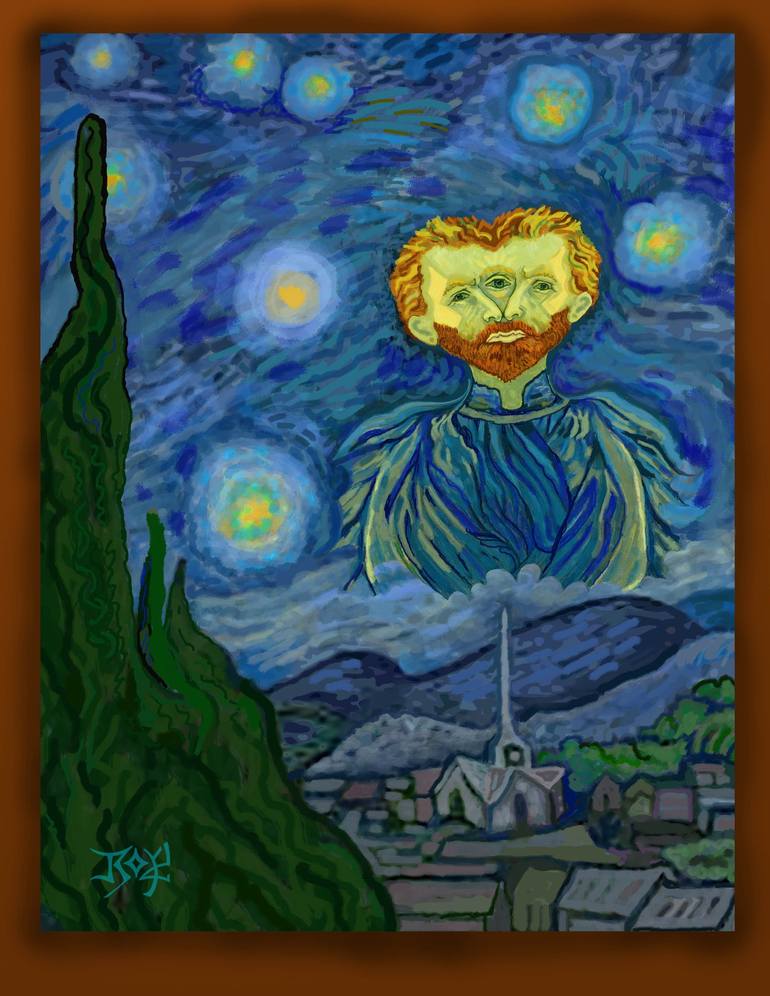 Van Gogh, you gotta love him. When I saw his work in the Louvre, I was stunned by the beauty and layers of meaning of his pictures. The picture here, is related to a recent work that I did called, "Triple Skull". I tossed the idea of merged heads around in my skull. I wanted to do Van Gogh. He...