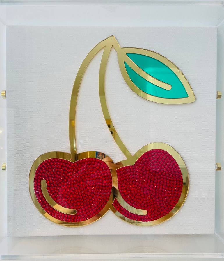 "Very Cherry" is a 3D mixed media Pop Art piece by California-based artist Flannery Good. It was created to celebrate and elevate that quintessential summertime fruit - the cherry! *Laser cut acrylic red cherries outlined in gold with mirrored green leaf *Over 1,000 genuine Swarovski crystals *Ga...