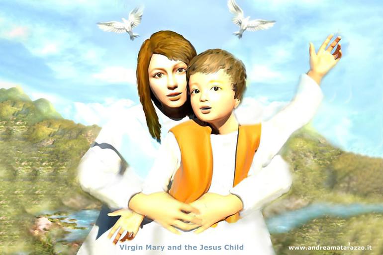 A modern interpretation, renewal of the sacred religious theme, depicted through the centuries by great artists. Mary and the Child Jesus greet us and bless us by giving us all Faith and Hope and Consolation, for the problems and difficult moments in which we live. An image of an Embrace, of Univers...