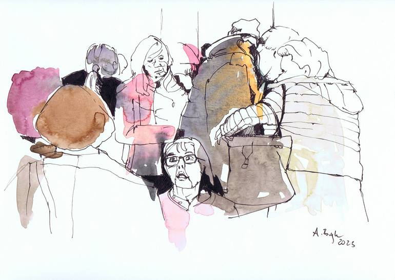 Visitors at the opening of an exhibition, captured using very quick brushstrokes on a watercolour background. This mixed media drawing comes in an off-white mount.