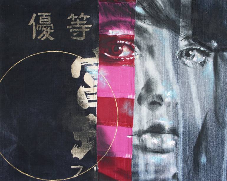 This portrait was produced in my usual format of adhering found and vintage textiles to a wooden panel. The fabric used here are fragments from a vintage japanese shop apron with Kanji text. The red and pink area is an american flag, and on the right is denim The portrait is a striking side profile ...