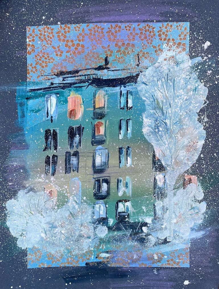 Winter Fairy Tale is a captivating mixed-media painting that transcends the mere depiction of a winter night to explore themes of warmth, resilience, and connection. At its heart, the illuminated building symbolizes the warmth of human presence amidst the stillness of a snow-covered landscape. The d...