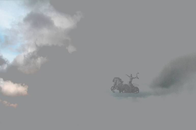 Arrival of War, the masterful statue from Gyorgy Zala, in abstract gray landscape with stark clouds