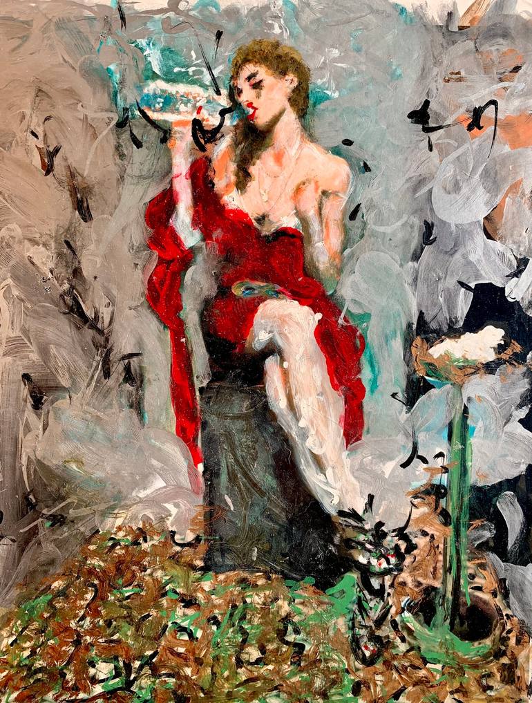 Born in Parma (Italy), she has lived in Bologna, Palermo, Rome, Milan, Vienna, and Berlin. Following the effects of the 2020 lockdown, she decided to leave Berlin and move to the countryside in the Sicilian hinterland. Rediscovering the benefits and inspiration of living in close contact with nature, she chose to stay there with her partner, occasionally traveling for work, leisure, and personal growth. About my work: “Light caresses of nail polish, acrylic color laid with a reasoned thrift frequently transmuted into anger and hysteria, strokes of full-bodied lipstick capable of restoring carnal sensuality to frigid cover beauties, herein do we behold Militello intent on completing her precious creations. Her atypical work has remote beginnings, from the purely feminine act of habitually leafing through a fashion or lifestyle magazine; it is from that absent-minded browsing that the young Sicilian artist’s quest began, a truly ardent desire to possess, distort and reinvent images. As with the most relentless of predators, her choices are cunning, including photos of women, men, and sometimes even children, from which she will revolutionize clothes and make-up, which, and this is the innate talent, restores expressiveness and feeling. Painting on a blank canvas ensures total freedom for an artist; overlaying paint, instead, requires rigor and discipline. The substrate image, initially “the master,” now overwhelmed with a suffocating cover painting, strives to emerge at all costs. Sinuous bodies, never static, are sometimes willfully sketched and incomplete, with nudity never being vulgar. Posing for fashion magazines, figures of elegant bearing, proud and distinct in their painstakingly artificial scenic presentation, are the women to whom Militello returns spontaneity, expressiveness, and form. Each of her works captures a different essence. Her colors emanate meaning, predominantly in the passion of red contrasted with the darkness of black and the brightness of white. The most intimate expression of Militello’s emotions occurs in her inner balance between logic and creative dexterity. The result is the admirable transposition of feelings, in the static physicality of the elaborated figures, all of which reach toward the infinite of personal and collective existence. In the more mature phase of her creative process, the artist decided to evolve in her use of magazine pages, experimenting with new materials from billboards, the industry’s “pop art.