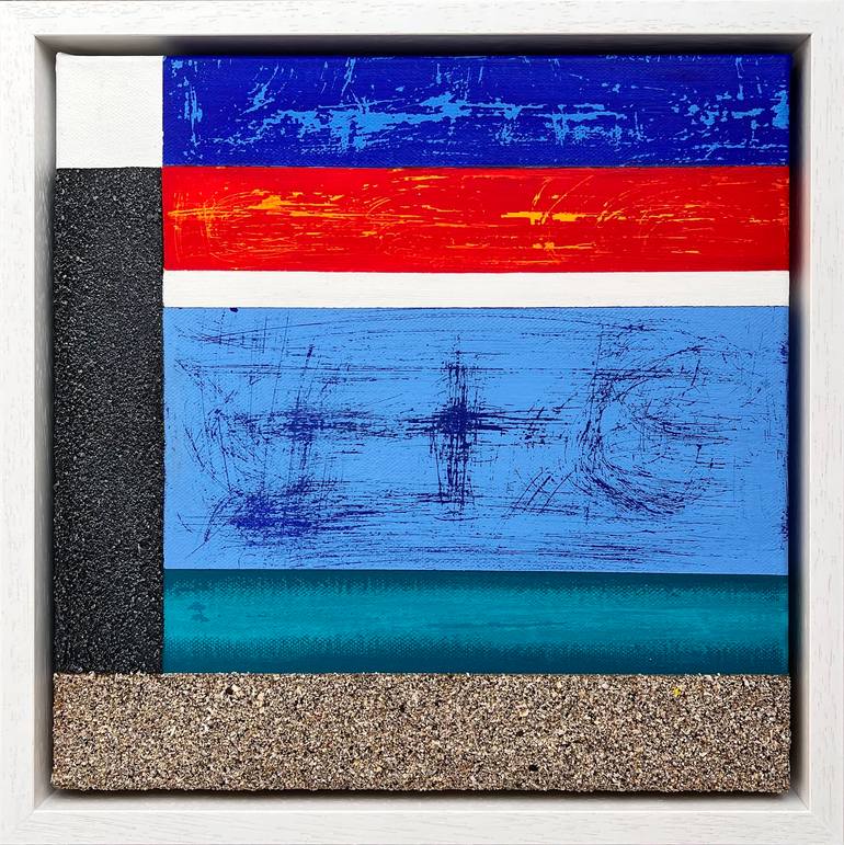 The Wharf paintings forms part of Shelley's Harbour Collection – inspired by the elements to be found in a working harbour - particularly a boat resting on the sand, with the ocean evident as well as the Harbour wall. It is made of acrylics, sand, wax and resin on box canvas, framed in a white woo...