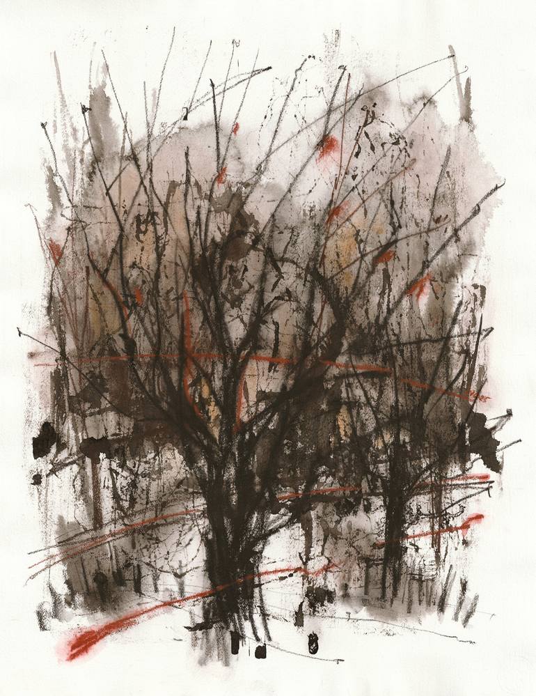 A semi-abstract landscape inspired by gusts of wind in a garden in the middle of winter. Snow, a few dead leaves on the black branches of bare trees. Setting sun. The interplay of ink and watercolor creates a mysterious depth, giving free rein to the viewer's imagination. A work that transcends word...