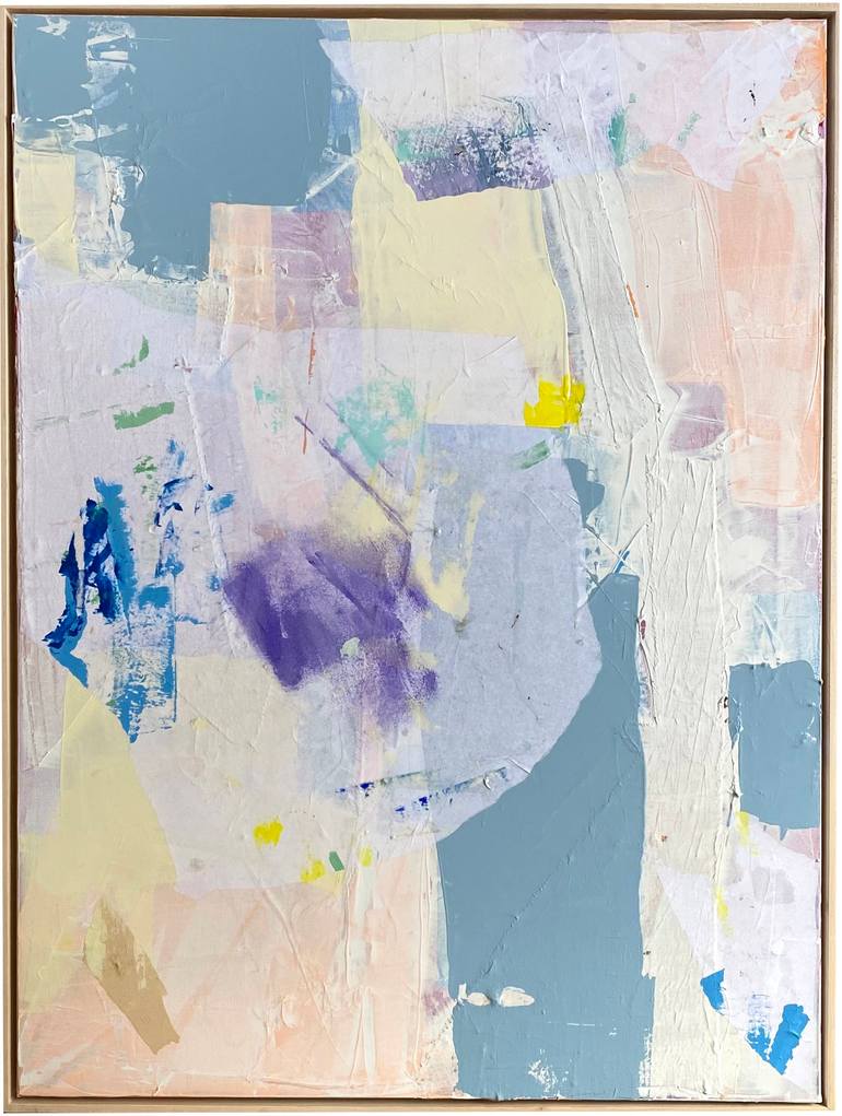 Acrylic and collaged papers and textiles on stretched canvas completed in 2024. Signed and dated on the back. Edges are white with paint drips visible. Framed in unfinished maple and wired on the back for easy hanging.