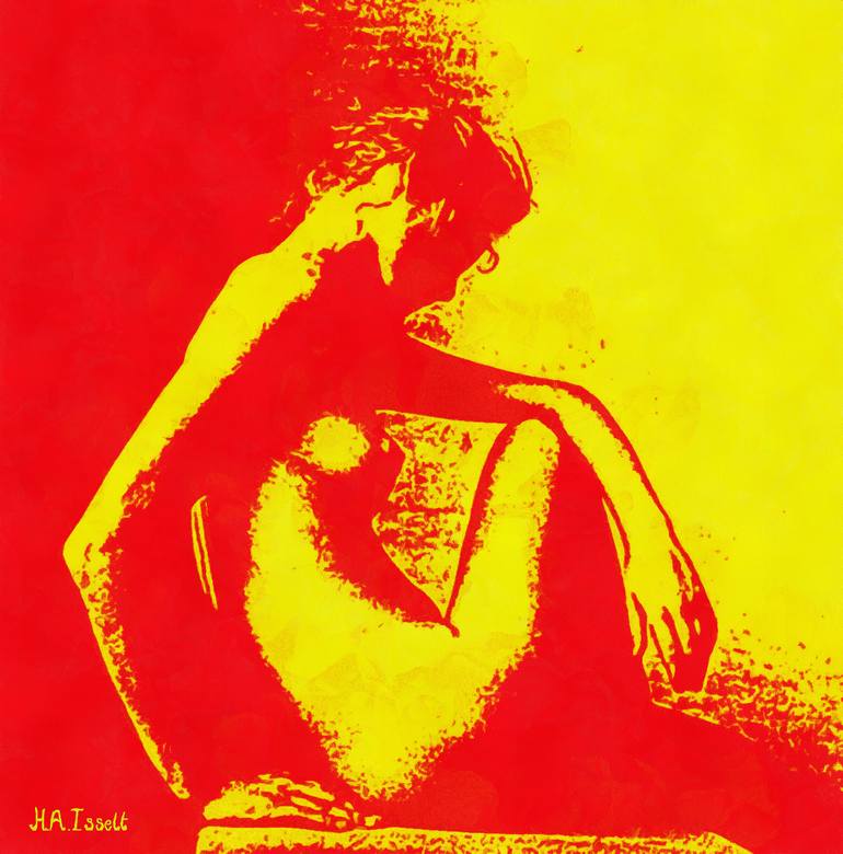 Digital Painting of a woman posing. Colors yellow and red. By Humphrey Isselt.
