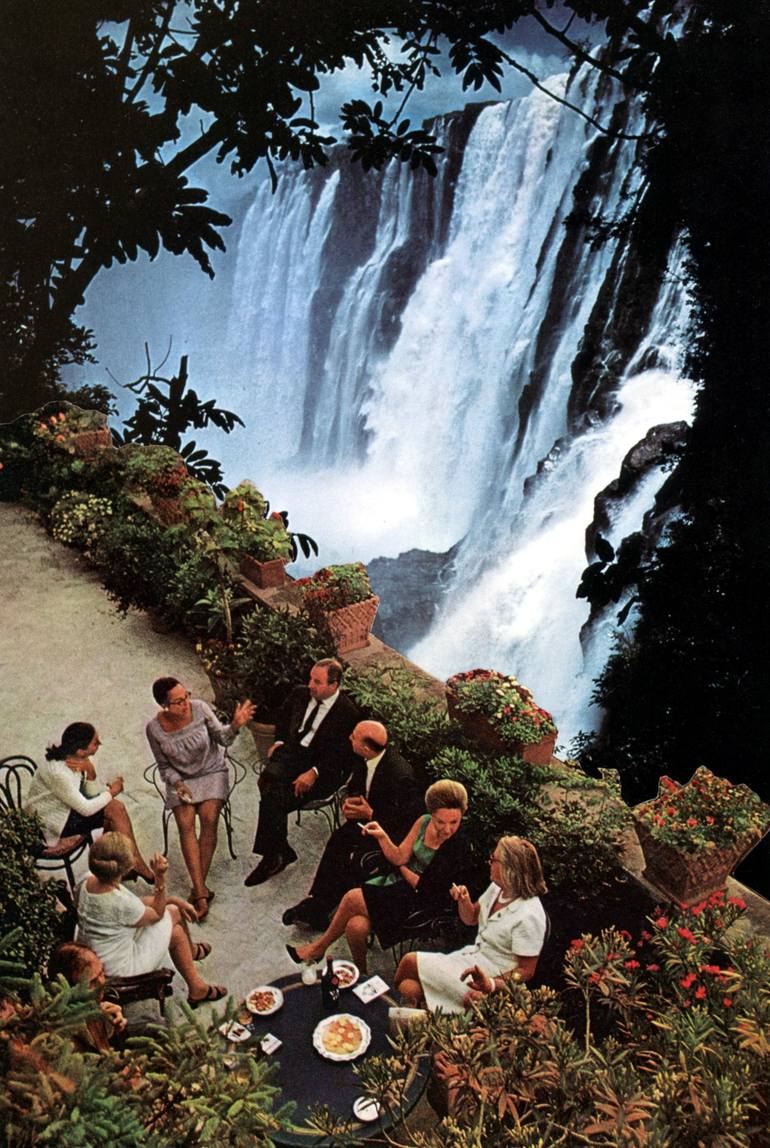 Guests gather and talk at the Zambezi Retreat overlooking the falls, although the thunderous falls drown out their conversations. Analog, handmade collage, 2024