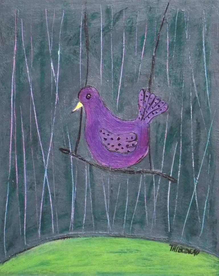 An acrylic, mixed media painting; a purple bird in it's cage with a floral, fabric cloth with purpose as a birdcage cover The edges of the fabric are hand sewn and securely, nailed on the top ledge of the painting Inspirations arose from; Memories of our Grand Memere who had a bird and faithfully,...