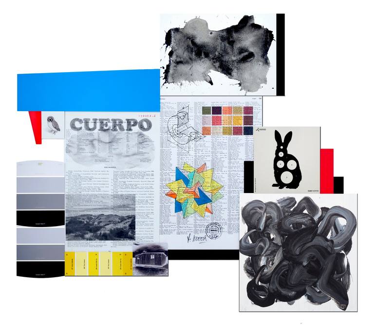 CUERPO.2024. (72 x 62.5 centimeters) (Acrylic paint on wood and cardboard, watercolor, photographs by the author (Concón Dune Field, Valparaíso), graphite, stamp, pantones, acrylic plates and digital prints on geographic atlas sheets). This installation corresponds to a series that I have called Nat...