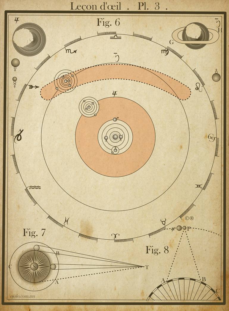 Step into a poetic fusion of astronomy and perception with "Leçon d’œil". This piece draws inspiration from antique astronomical charts, blending planetary orbits, zodiac signs, and fine diagrammatic lines in a warm sepia palette. At first glance, the composition echoes a scientific plate—yet look c...