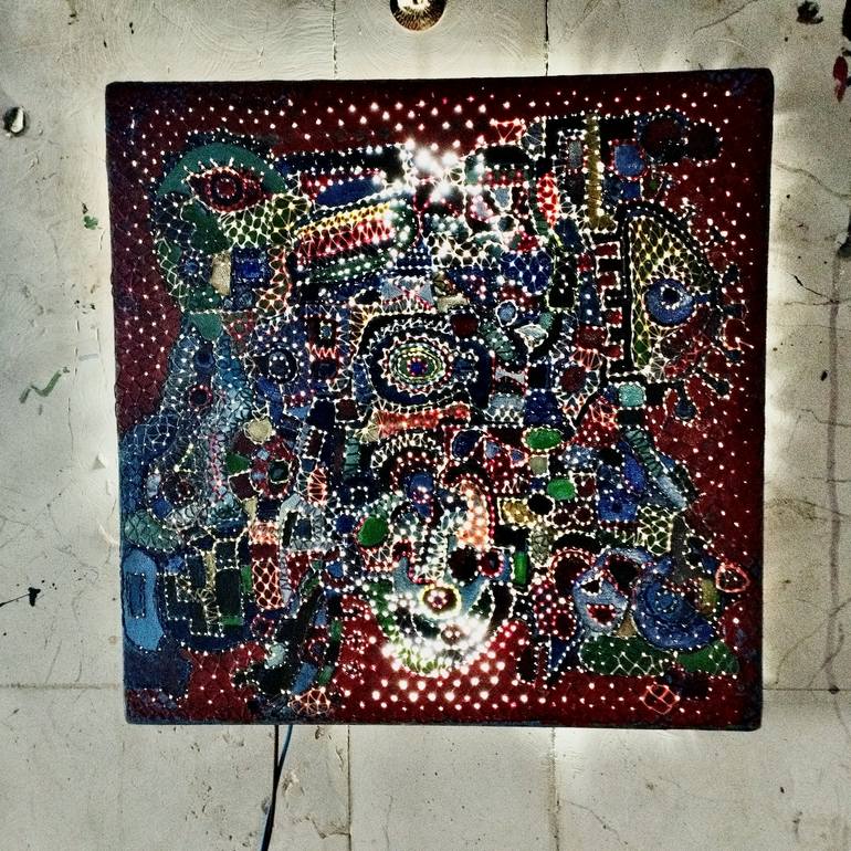Always good to have a nightlight to make you feel more secure in the dark , acrylic paint different color threads , special kind of embroidery , LED lights . Several portraits and figures .