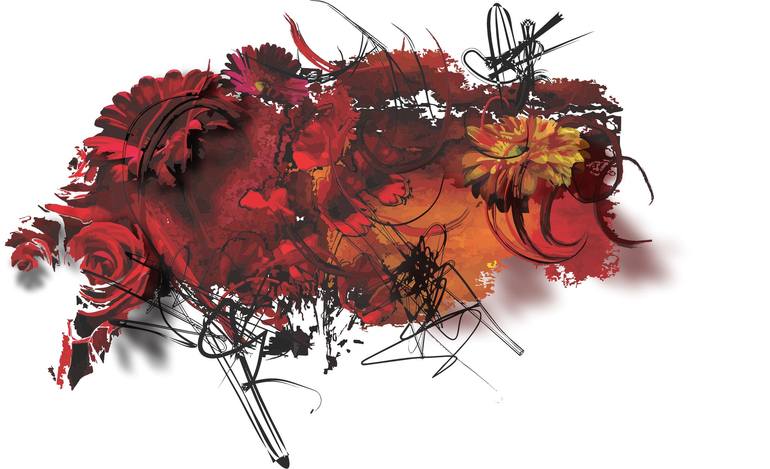 Las flores parecen emerger de un fondo etéreo, como si estuvieran flotando en un sueño vibrante, en su esplendor, parecen estar en un estado de transformación, como si la naturaleza misma estuviera en medio de su magnífico florecer. Las pinceladas naranjas añaden un toque de calidez y energía, contr...