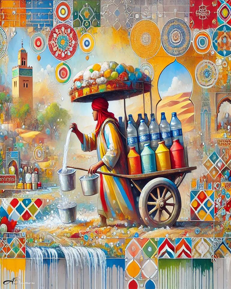 Vibrant pots sit atop a cart in a busy market, and a water seller stands nearby in colorful traditional Moroccan garb. Intricate architectural details of domes and buildings frame the vibrant scene, as a crowd of people move through the sunlit street.