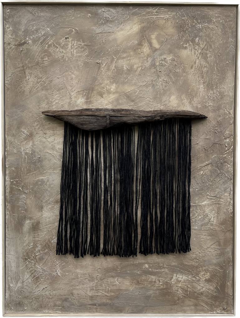 48 x 36 x 3. 4 layers of plaster + concrete + sand + crystal quartz grounds + arizona rock pigment (glen canyon) on canvas housed in a handcrafted, natural maple wood frame. she is detailed with a piece of drift wood we found at Sullivan’s island, that I decorated delicately with black yarn. eternal...