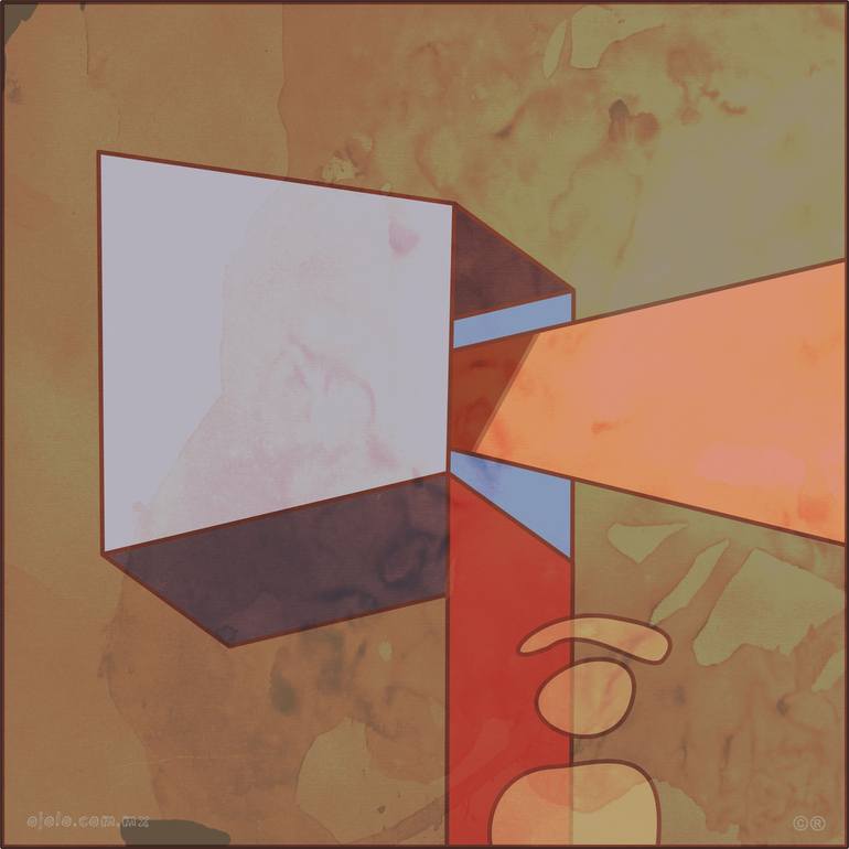 Geometric forms float against organic texture—digital vectors overlaid on photographed paper stains. The cubes suggest architectural space, impossible perspective, Escher-like ambiguity. But the textured background (coffee stains, paint drips, aged paper) anchors them in physical reality. This is co...