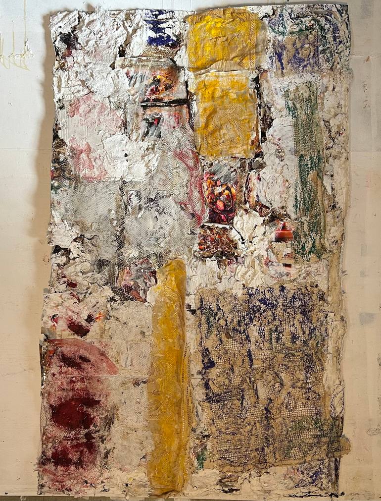 There are 5 layers. Nori seaweed, burnt ciba chrome prints, paper infused plaster,lace+plastic and paint.The backing is drop canvas It displays look of wear and deterioration. Unframed canvas.Thank you. Enjoy!