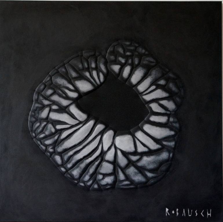 The free use of his own resources is the fundamental disposition in which Christoph Robausch's works are created. Standing outside the traditional art world, Robausch ventures into the open and unsupported realm. Without fanfare, solely from the inherent potential, his sculptures, wall objects, and relief-like panel paintings emerge. For his metal sculptures and wall objects, Robausch uses aluminum components of a thickness that he can still shape by hand. He enjoys reworking earlier pieces, deforming and retuning them. The open nature of the possible is also the driving force behind his translation of physical works into digital, dynamic worlds. Currently, with his series "Future Origin - Oraculum," he is rediscovering his initial working method, strongly influenced by the inherent qualities of the materials. The unpredictable immediacy shines through the works of this enigmatic series. For these flat sculptures on canvas, Robausch uses a highly heat-resistant, synthetic wax. It essentially petrifies as it solidifies on the raw canvas. For further surface treatment – ​​both canvas and metal – ink, iron rust, and copper patina are preferred due to their vibrancy and unpredictability.