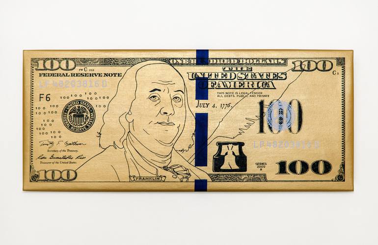 $100 US Currency 06 (Gold) Acrylic Paint on Canvas 14 x 33 in. (35.56 x 83.82 cm) Original -- A new direction in “photo-elemental art” in which I employ the images of paper currency as elements of the creative process. My method utilizes photographic and graphic techniques to re-express the ima...
