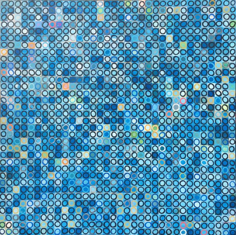 This original 68 x 68 inch (172 x 172 cm) painting is divided into 1156 squares, each 2 x 2 inches. Background is acrylic, and each circle is oil pastel. Signed on the back and wired, ready to hang. Edges are painted black. Please contact me with any questions: