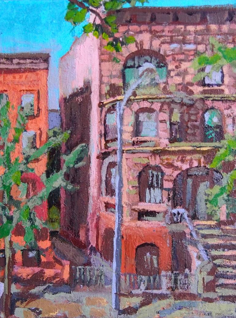 I lived in Harlem with my now-husband for a year before we moved to our current home. One summer I decided to paint the brownstone across the street. It was hot as hell. I liked how the buildings looked like pink marshmellows. It's a delicious little scene.