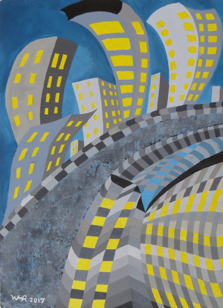 In this painting I wanted to show the heart of cities with their windows like eyes looking down on winding roads and hidden monuments among the buildings. I plan to do a larger painting that expands on this same idea. This was done on watercolor paper and then affixed to a cardboard backing. The who...