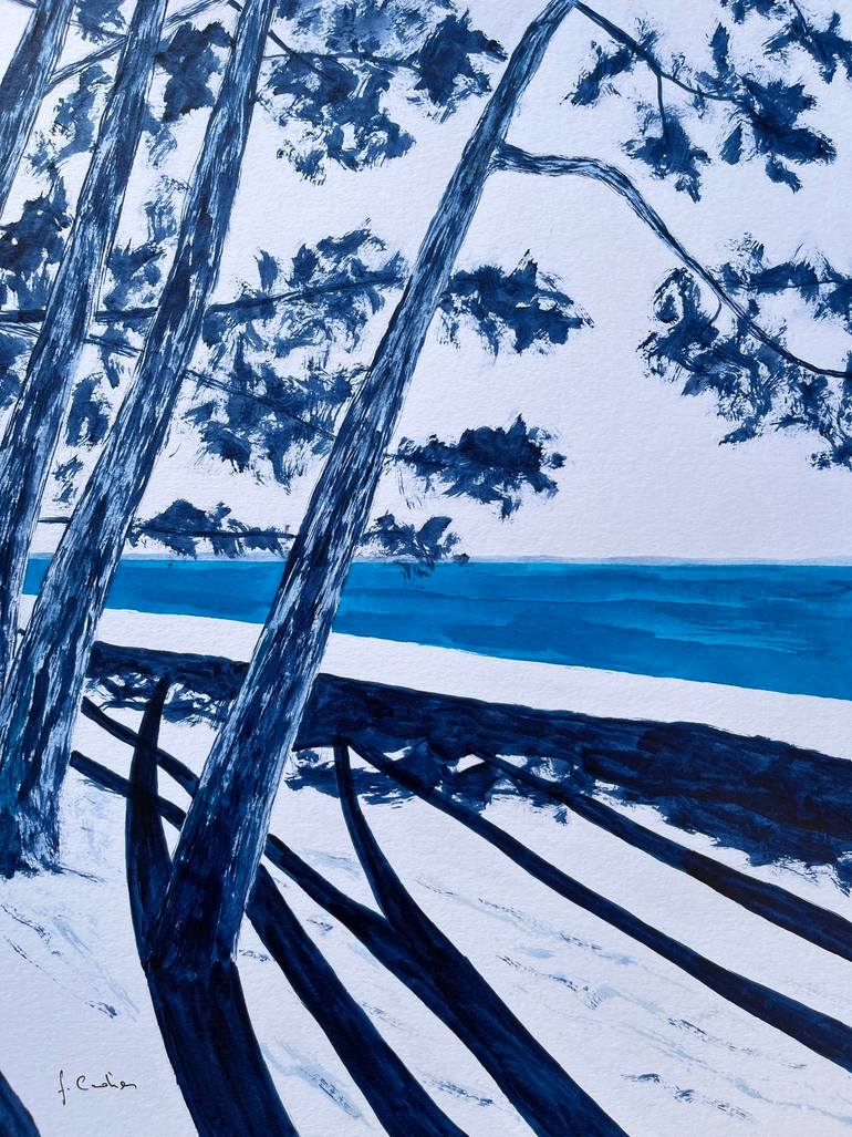 Indigo and turquoise ink on fabriano paper. Natural Wood frame. This striking artwork depicts a minimalist coastal landscape, bathed in blue and white hues. The trees, with deep blue trunks, stand elegantly on the left, their shadows extending in dynamic lines over the snowy ground. In the backgro...