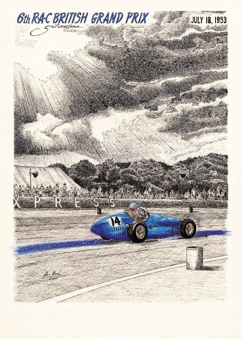 1953 British Grand Prix – Tony Rolt A series of graphic artworks ‘Formula 1. The beginning’ Date: 18 July 1953 Circuit: Silverstone, United Kingdom Team: RRC Walker Racing Team Race Car: Connaught A Type Lea Francis 2.0L Driver: Tony Rolt Architecture & Landscape: Becketts turn Many details are...