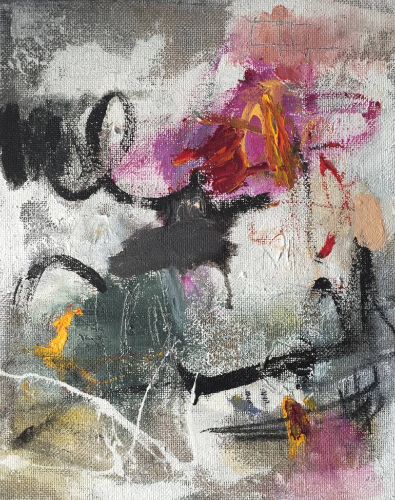 This is the second and a suite of three paintings painted on burlap. The paint is thinly applied making the texture every bit as important as the paint itself.