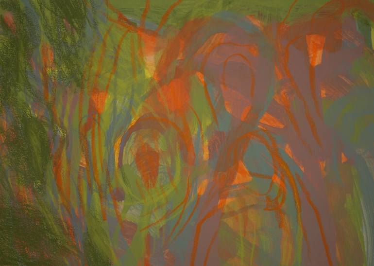 Acrylic and water soluble wax crayons on 300 gram watercolour paper. The paper is mounted with masking tape during painting which leaves about half an inch of clean edge all around. Dimensions refer to the edges of the paper. See included photo of the whole painting. See the main, cropped, photo for...