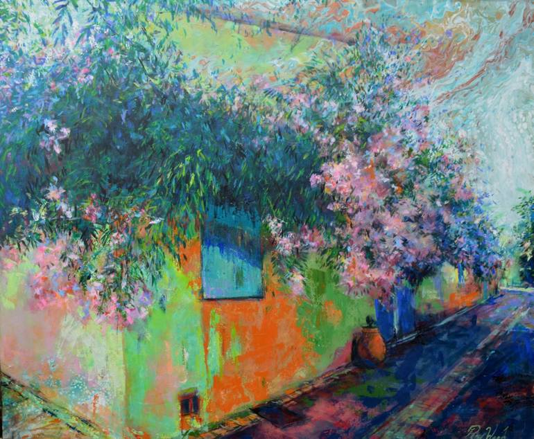 A large multi method work using acrylics with sea sponge, sponge roller, painting knife, cement trowel, PVA glue and silicone oil and brushes. Based upon a street in an Isle in Provence.