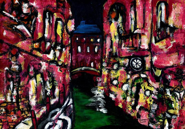 Pintura Mixta con paisajes urbanos expresionistas de la Artista Carmen Luna.