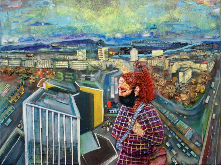 My works are representations, reconstructions of people living on the periphery of society made of things thrown away and a reflection on certain spiritual, mental anomalies beyond the signs of today’s existential crisis (e. g. everybody on the subway is fiddling constantly with his mobile phone): the increasing alienation and atomization of consumer society (a sombre, obsessive worshipping of high-tech instead of conversation, reading or contemplation), it becoming uniform, and today’s oppressing technical fetishism, pervading everything. Through the recycling of trash, the combination of glued and painted elements I represent iconic scenes of poverty and high-tech fetishism, and I create bizarre human figures (statues) made of trash. I also use “found” motives as a basic layer of my paintings: e g. some elementary, instinctive drawings (painted figures) of small children in contrast to the mannered figures put in the foreground, referring thus to the instinctive, elementary wholeness of individuals in their childhood, in contrast to the general “brokenness” of adult people (in Hungary). As a background I use for instance the maps of transport networks, that will, according to my expectation, well symbolize and represent the “tissue” of my figures and of human fates and life’s journeys in general. My method of creation is based in a technical sense on erecting problems, obstacles and limits and trying to overcome them. By following and examining art history I try to reach the quality of my examples. That is, I sometimes try to paint with the simplicity and the abstraction of Mario Sironi, to “evoke” his block-like figures in today’s urban environment, some other time admiring the creation of the Merz works of Kurt Switters I also try to construct half abstract relief paintings. But I could endlessly enumerate the works and artists influencing me. I strive for a multi-layer painting, therefore I appliqué everything on my paintings, sometimes I cover them with a net, and I build them further by painting them over. I am influenced by the scene-like compositions of Italian metaphysical painters and the moving figures of Francis Bacon too. My figural view suggests a sense of life of the 21st century, where I try to aestheticize as little as possible.