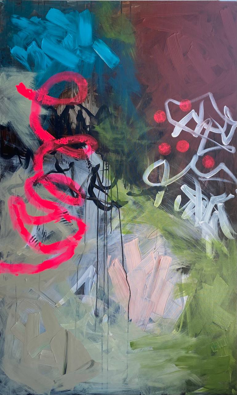 Every corner of this painting has a different aura. The middle being a bid more playful and the edges having a much calmer feeling. This painting makes the eye move across the painting. It's a perfect balance of color, contrast and fun.