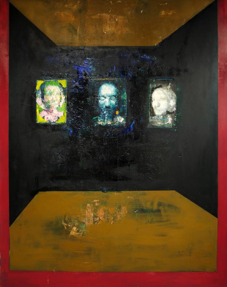 Paintings within a painting. 3 different portraits suspended within an abstract space.