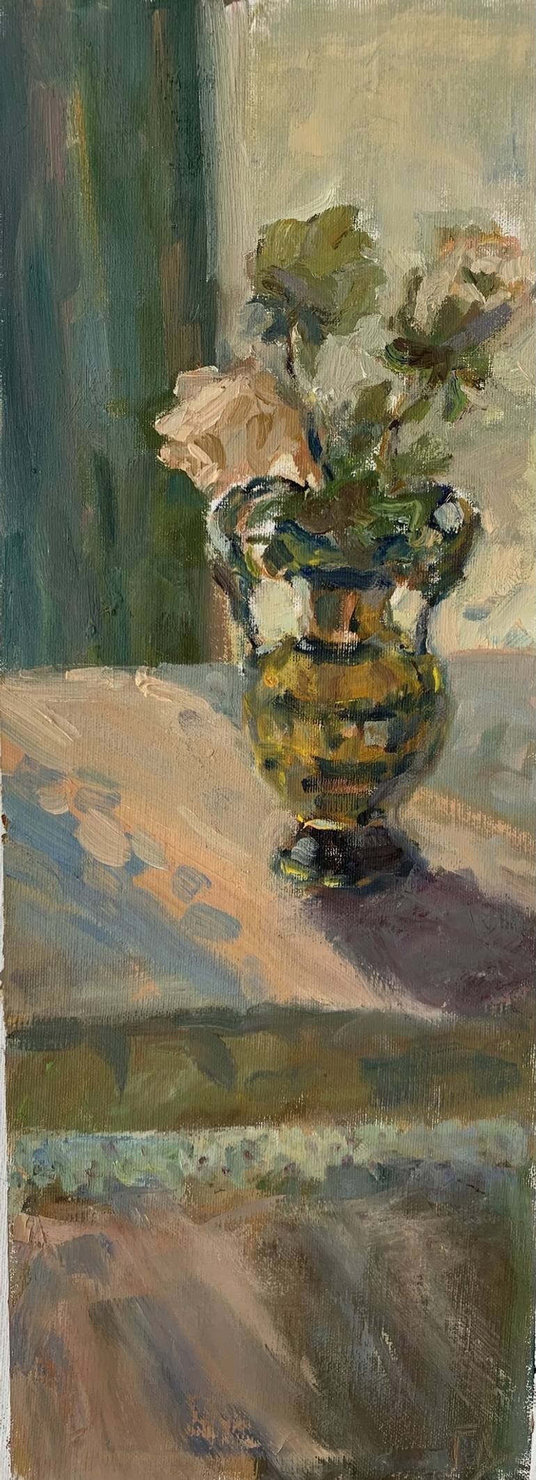 This painting is impression of wonderful sunshine, shadows and roses. The painting is totally unique with unusual size of the picture. The sizes include wooden frame. It's ready to be handle on the wall.